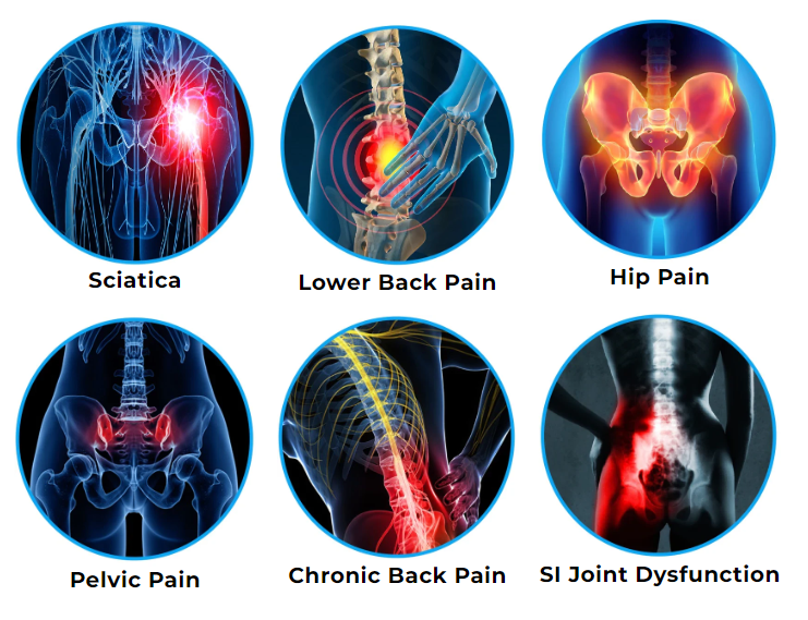 - Relief from sciatica, lower back pain, SI Joint pain, and hip pain.